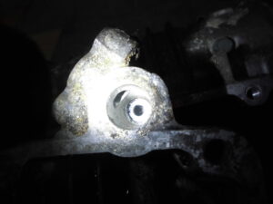 ここは通常小さな穴がありオイルクーラーの抵抗が大きくオイルの供給不良対策でオイルクーラーを通さずオイルを経由させる為の穴なのですがなぜか拡張されている・・・![]()